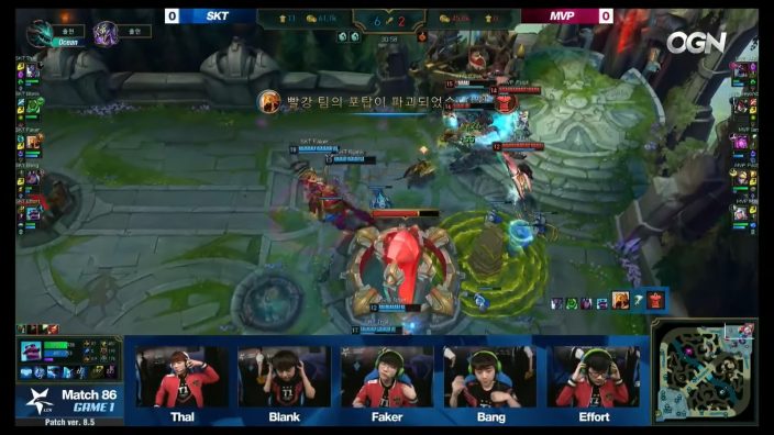 23分鐘MVP擊殺Effort後順勢拿下飛龍,SKT利用MVP的視野盲點偷打巴龍成功,並於三路將小兵推進MVP的高地。30分鐘SKT擊破三路兵營後繼續向MVP的主堡進迫,最終成功拿下首局勝利。