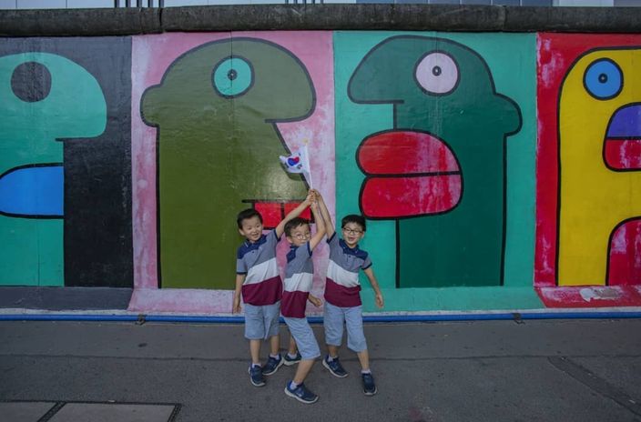 男星宋一國在光復節當天post三胞胎兒子大韓、民國和萬歲在柏林圍牆前拿著太極旗的照片